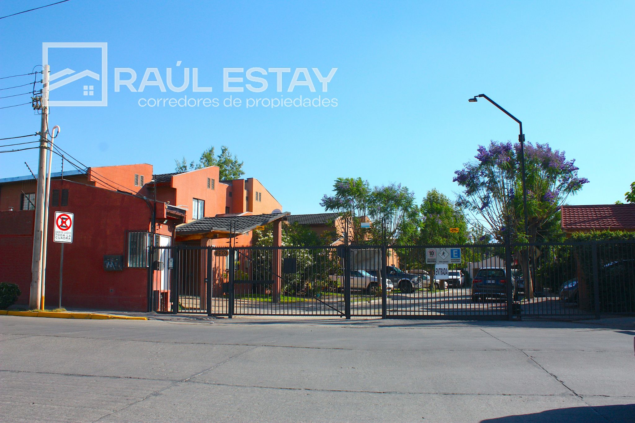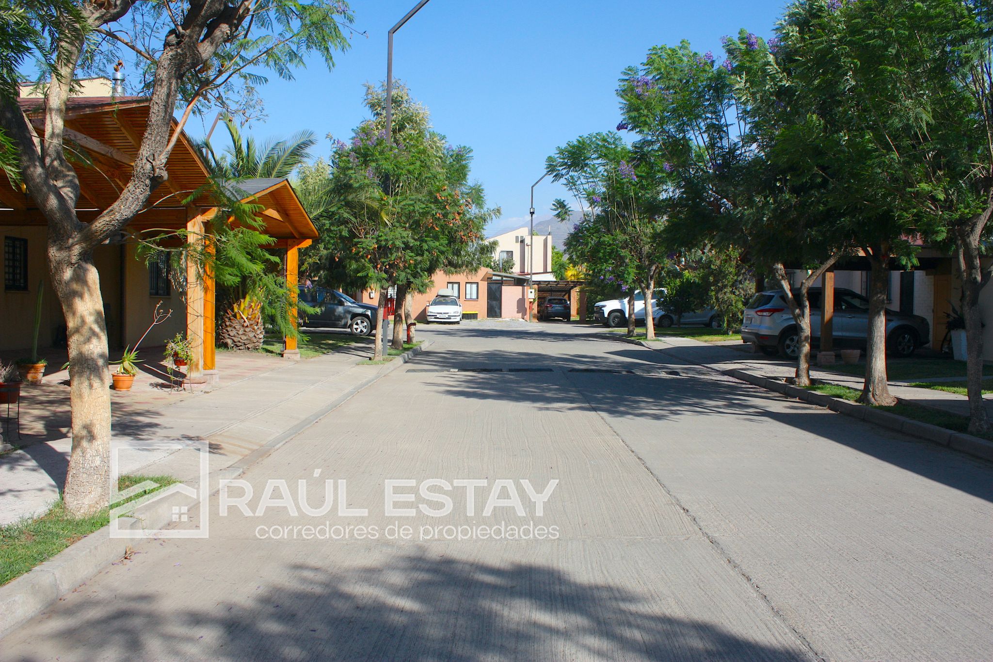 Calle de acceso al Condominio de doble calzada. Portón eléctrico, citófono a cada casa, áreas verdes. Excelente ambiente.